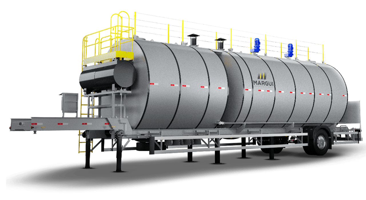 O Tanque de Asfalto Móvel Margui é projetado para garantir armazenamento seguro e manutenção da temperatura ideal do CAP (Cimento Asfáltico de Petróleo). Equipado com sistema de aquecimento e isolamento térmico, permite conservar as propriedades do material, evitando perdas de qualidade durante o armazenamento e a aplicação. O controle térmico eficiente contribui diretamente para a performance da mistura e para a qualidade final do pavimento.